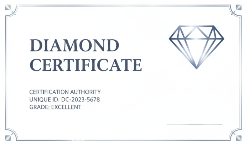 A certificate (also known as a diamond grading report) is an official document issued by a recognized gemological laboratory. It describes your diamond’s characteristics, including the 4Cs — Cut, Color, Clarity, and Carat Weight — and confirms that it’s a natural, genuine stone.